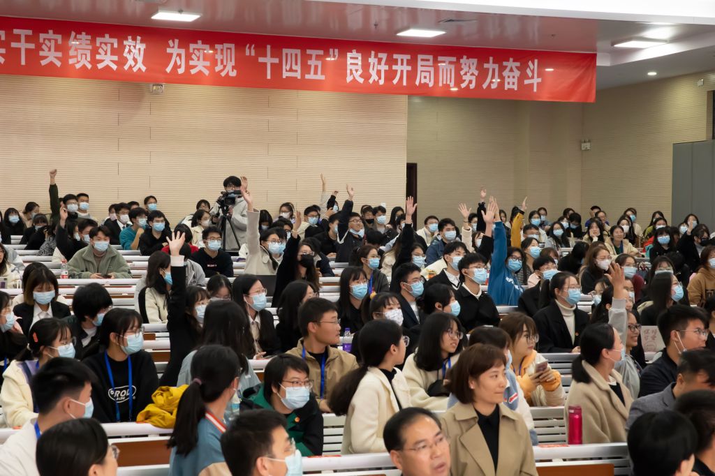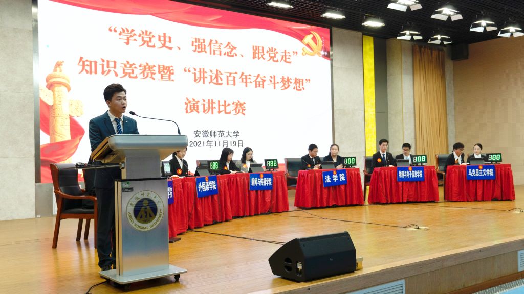本网讯(青通社 朱蕾 李珂 刘晨)为深入学习贯彻党的十九届六中全会精神,11月19日晚,学校在花津校区理科大楼报告厅举行“学党史、强信念、跟党走”知识竞赛暨“讲述百年奋斗梦想”主题演讲比赛决赛。校党委常委、副校长陆林和有关部门负责人、部分学院党委副书记、各学院团委书记以及学生党员、团员代表300余人到场观摩。马克思主义学院副院长、教授李祥兴担任主任评委,文学院副教授汪红艳、历史学院副教授王彦章、新闻与传播学院副教授张荻、马克思主义学院副教授佘君担任评委。