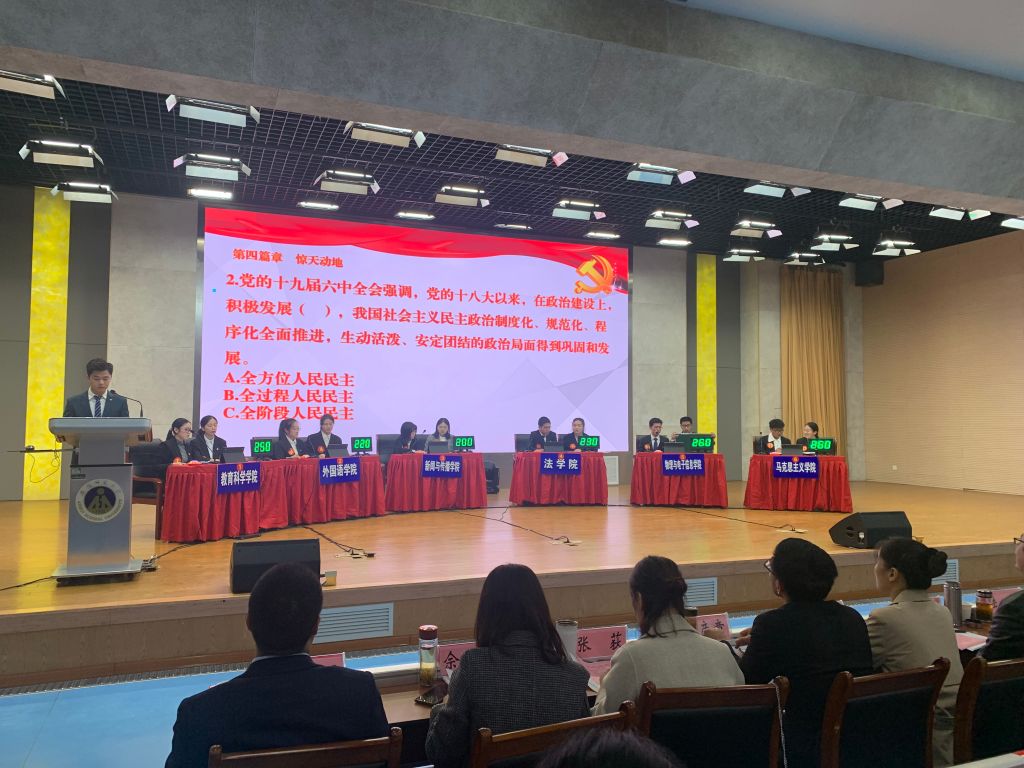 经前期初赛、复赛选拔,共有6支学院代表队成功入围本次比赛决赛环节。比赛分为“开天辟地”“改天换地”“翻天覆地”“惊天动地”四个篇章,分别围绕新民主主义革命时期、社会主义革命和建设时期、改革开放和社会主义现代化建设新时期以及中国特色社会主义新时代的篇章主题设计题目,每个篇章包括知识竞赛和主题演讲两个环节。知识竞赛环节融问答、竞技、互动等形式于一体,包括必答题、抢答题及风险题多种题型,围绕中国共产党历史、习近平新时代中国特色社会主义思想,特别是党的十九届六中全会精神为重点内容,全面检验参赛选手学习党史党情的成果。比赛中,各参赛选手积极踊跃、密切配合,竞争激烈,高潮迭起,观众积极互动,不时报以阵阵掌声。“讲述百年奋斗梦想”主题演讲比赛中,参赛选手结合自身的青春故事,围绕篇章主题,声情并茂讲述了自己在党史学习教育中的感悟与成长。作为助演嘉宾,文学院2019级汉语言文学专业的曹静带领大家回忆了陈延年和陈乔年的故事,呼吁青年学子饮水思源、不负前恩;地理与旅游学院2020级地理科学专业的阿卜来提•阿卜力克木分享了从军路上的豪情担当、报效家国的初心梦想。选手们真挚的语言、饱满的状态、昂扬的激情赢得现场一次又一次热烈掌声。