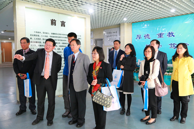 本网讯(党委宣传部 张鑫)4月8日,参加第十三届两岸高校人力资源开发与管理研讨会的台湾高校代表团一行赴我校交流访问。省教育厅外事处处长丁育红与校党委书记顾家山、校长王伦、副校长王绍武热情接待了来宾,并进行了深入交流,皖南医学院及我校相关部门负责人陪同了访问。
