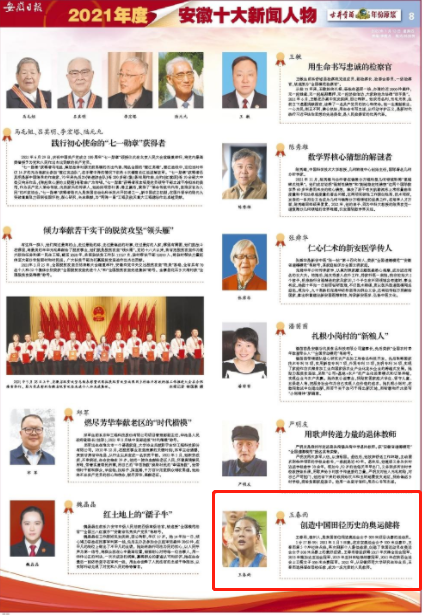 2021年12月22日,安徽日报正式启动2021年度安徽“十大新闻”“十大新闻人物”评选活动。2021年评选活动,采取网友投票和专家评议投票相结合的方式,从候选条目中评选出本年度“十大新闻”“十大新闻人物”。1月12日,2021年度安徽“十大新闻”“十大新闻人物”评选揭晓,我校王春雨老师成功入选2021年度安徽“十大新闻人物”。