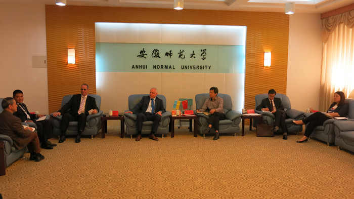 4月20日上午,校长王伦在行政楼会客厅亲切会见代表团全体成员并进行了友好的会谈。王伦对弗洛罗夫先生第一次来我校访问表示热烈欢迎。他首先向客人介绍了我校的沿革和办学基本情况。他指出,安师大是安徽省最大的高等教育机构,学科门类齐全,教育层次丰富,因此与扎波罗热国立大学有着广泛的合作空间。他期待双方能打破语言障碍,真诚合作,以共建孔子课堂为契机,为两校搭建优质的合作平台,促进中乌两国在教育、经济等领域更多层次和形式的合作项目。他希望弗洛罗夫先生通过本次访问能对安师大有更深的了解,期许两校共建的孔子课堂项目能尽快实施。