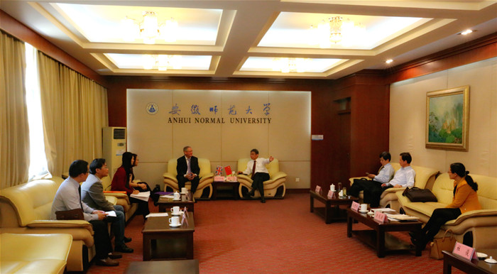 朱家存对来宾的到来表示热烈欢迎并向来宾详细介绍了我校的历史沿革及国际合作情况。他说,安徽师范大学早在10多年前就和德国高校开展了第一批合作办学项目。近年来,我校致力于加大国家化发展力度,和美国、俄罗斯、韩国、英国等国开展各种形式的学生联合培养项目都运行良好。近期,我校也正在和法国两个高校商谈合作办学具体事宜。朱家存说,2015年10月我校代表团访问亚伯大学,受到Glyn·Jenkins教授的热情接待,双方进行了真挚友好的会谈。亚伯大学美丽的校园环境和良好的学风也给我校代表团成员留下深刻印象。他希望,Glyn教授此次回访能够增进双方进一步了解,在生物和地理这两个双方都强势的专业上开展合作办学项目。