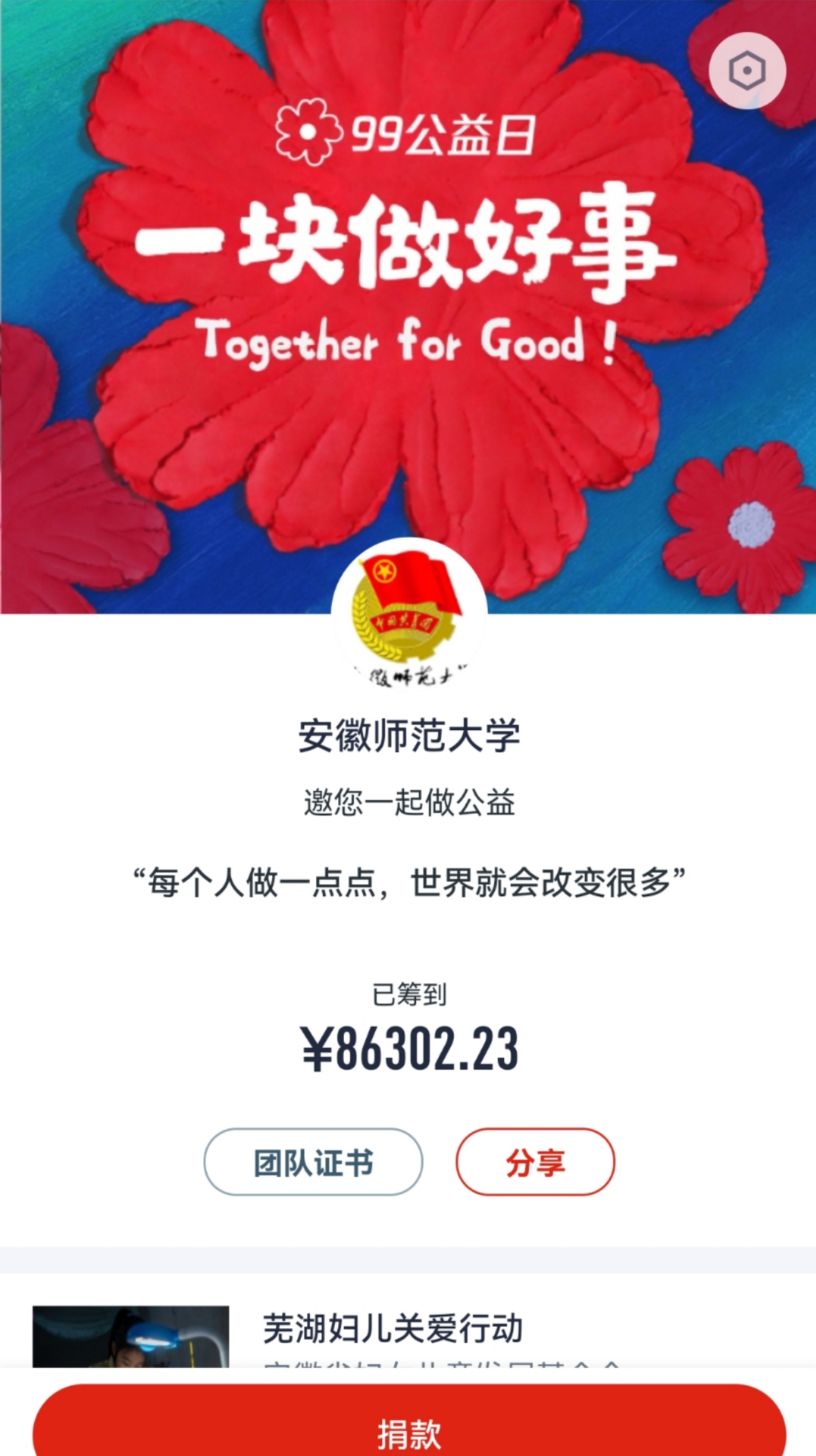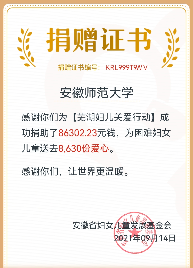 本网讯(校工会 校团委)爱传万家,温暖江城。9月7日至9日,学校工会和团委积极响应芜湖市妇联号召,在全校发起“99公益日”芜湖妇儿关爱行动,各分工会、班级团支部迅速行动,三天时间内组织近万名师生参与线上公益捐赠,筹得善款86302.23元。
