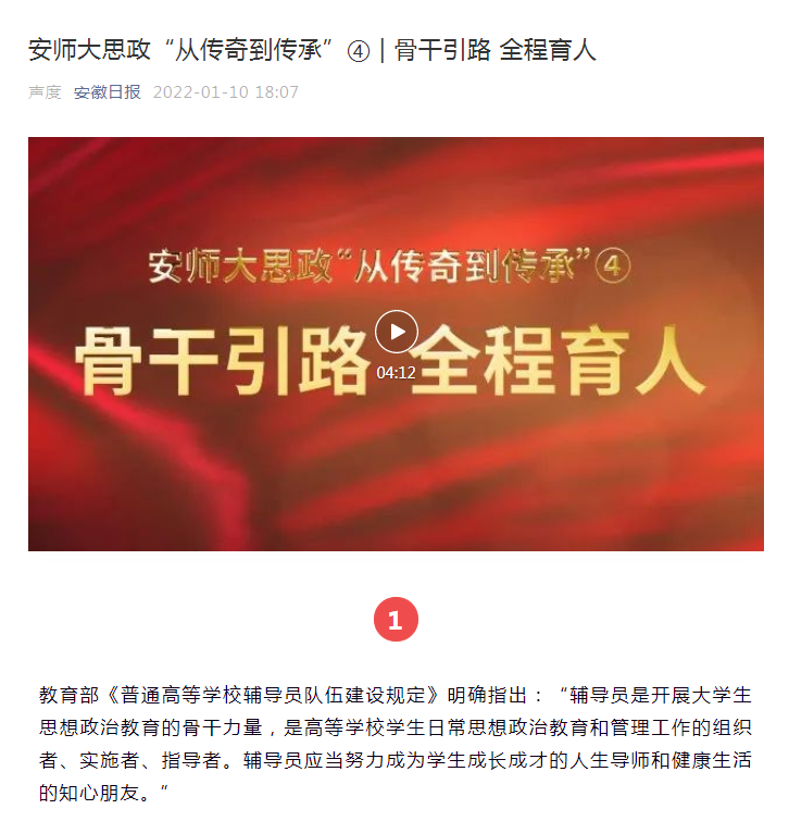 1月10日,《安徽日报》微信公众号推出我校思政育人工作系列融媒体作品第四期:安师大思政“从传奇到传承”④ | 骨干引路 全程育人。文章指出,坚持把立德树人作为中心环节,安徽师范大学把辅导员队伍建设作为教师队伍和管理队伍建设的重要内容,着力实施“强基计划”,完善制度建设,加强辅导员基础工作;“赋能计划”,分类、分层、系统提升辅导员素质能力;“培优计划”,培育辅导员工作品牌和典型人物,形成名师工作室、名师宣讲团、名师精品课程等一系列优质思政工作载体。