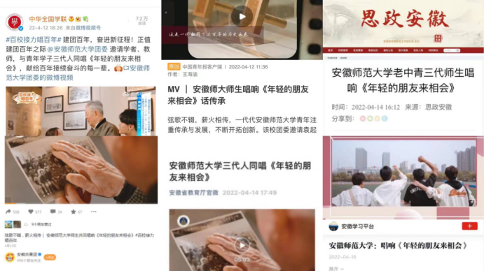 “啊亲爱的朋友们,美妙的春光属于谁,属于我,属于你,属于我们百年传承的每一辈。”安徽师范大学团委作为学校红歌接力的第一棒,结合时代要求,精心策划,对《年轻的朋友来相会》原词曲进行改编,并邀请袁起河、陶绪德、陶富源、路丙辉、俞晓红等一批学者大家、教师典型与青年学子三代人同唱一首歌共话传承,唱出了一代代安徽师大青年把青春奋斗融入党和人民事业,扛起伟大复兴的先锋旗帜的理想。该红歌视频一经发出,受到了共青团中央、中国青年报、中华全国学联、学习强国、安徽省教育厅、安徽团省委等多个官方平台转发与点赞,阅读量超百万,帮助青年学子进一步了解学习党的青年运动史,更在全校掀起红歌传唱的热潮。