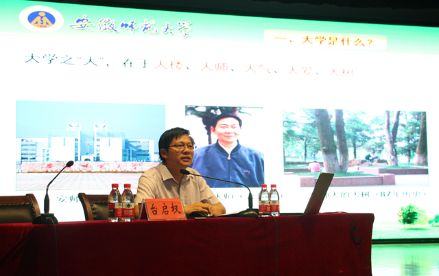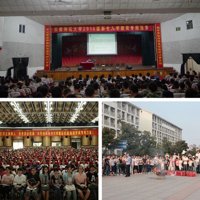 房玫、庄华峰、祝东进、阮成武、朱国萍等5位教授为同学们做了“名师谈大学”系列专题报告,名师们结合新生的实际情况和自身的教育经验,循循善诱、谆谆教诲,鼓励同学们以优良的作风,坚毅的品质和饱满的精神状态投入到大学生活中。芜湖市委原常委、芜湖军分区原司令员吴小明为同学们介绍了国家目前的安全形势与军队建设发展状况;芜湖市公安局网络安全保卫支队侦查大队队长葛斌通过网络信息时代各种诈骗案例的介绍,警示新生要具备防骗意识;学工部部长台启权以“我的大学我作主”为题向同学们重点介绍了大学成功的方法和路径;保卫处处长孙成岗作了校园安全教育专题报告并组织了消防安全演习;校团委书记梁燕介绍了素质拓展学分实施方案;档案馆馆长陈孔祥教授为同学们讲述了我校87年的办学历史、深厚的文化底蕴和取得的辉煌成就;校医院院长唐俊生强调了提高大学生健康水平的重要性,并为同学们提供了健康生活的建议;教务处老师们为新生梳理了学校教务教学的相关规定和制度;校大学生心理健康中心主任陶金花引导新生保持阳光心态、享受幸福大学;“青春导航”报告团开展了典型优秀大学生事迹宣讲,激发了2016级新生对大学的热情。