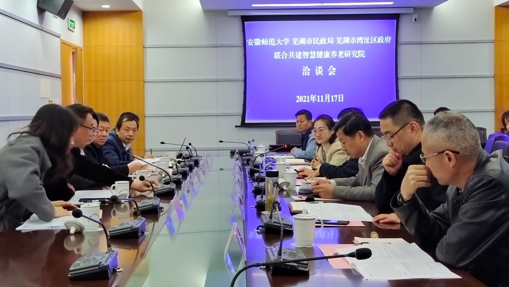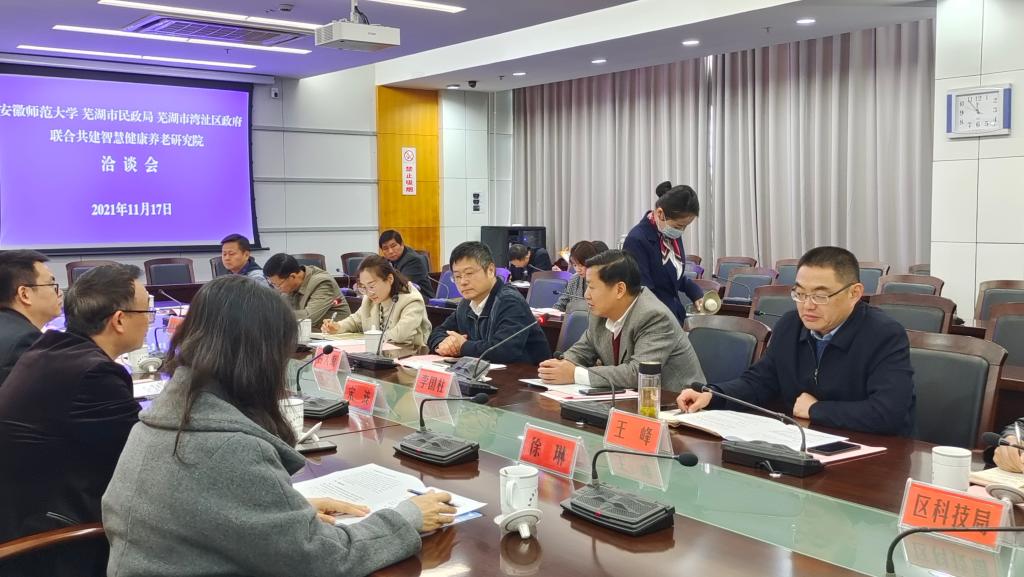 本网讯(计信学院)11月17日,校党委常委、副校长熊宇杰一行赴湾沚区洽谈智慧健康养老研究院筹建工作,芜湖市民政局局长古大海、副局长王峰,湾沚区委副书记、区长李国柱,湾沚区委常委、副区长梁燕,湾沚区民政局负责人,校科研处、社会合作处、计算机与信息学院等负责人参加了座谈会。