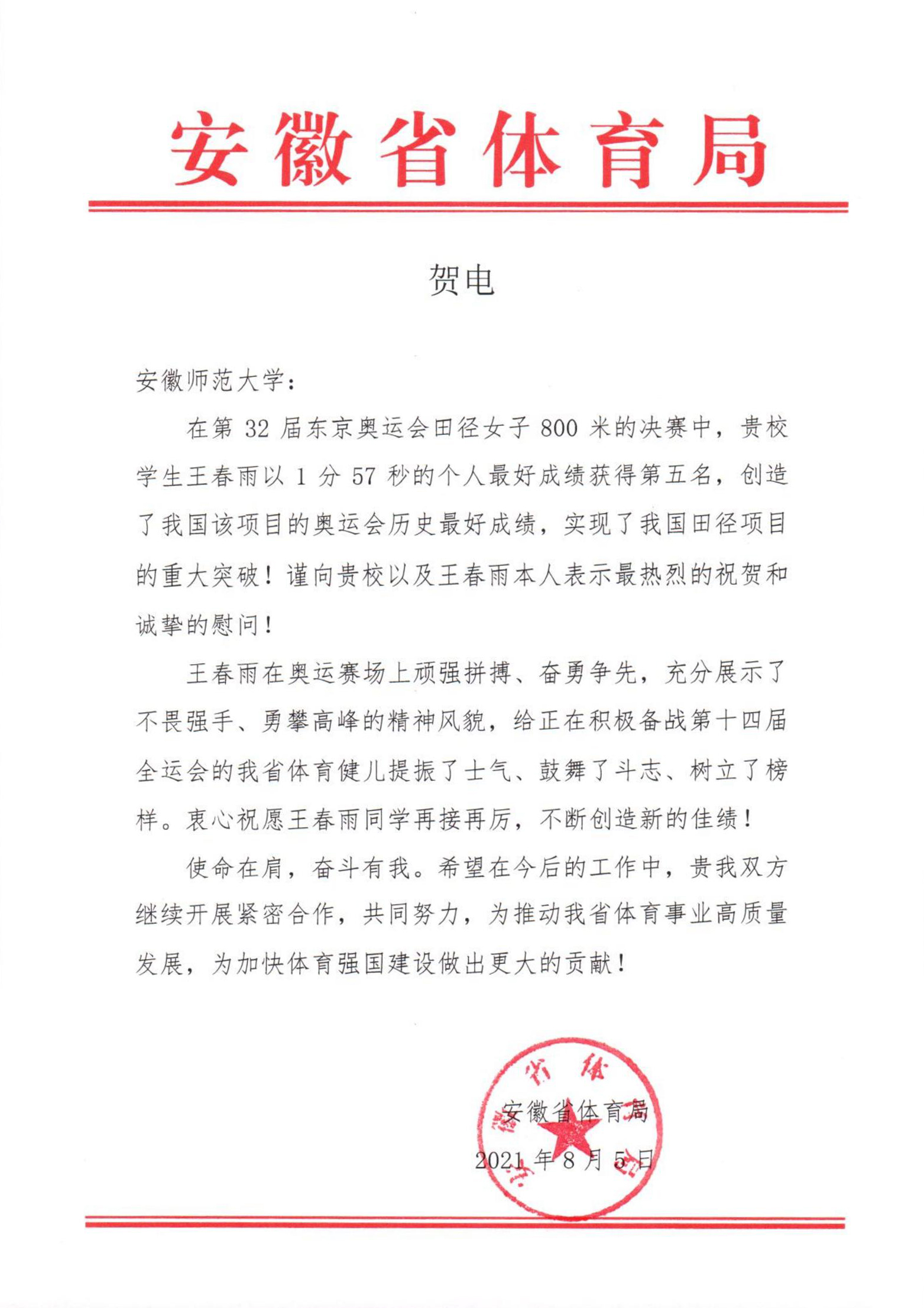 安徽省体育局在贺电中指出,在第32届东京奥运会田径女子800米的决赛中,安徽师范大学学生王春雨以1分57秒的个人最好成绩获得第五名,创造了我国该项目的奥运会历史最好成绩,实现了我国田径项目的重大突破!王春雨在奥运赛场上顽强拼搏、奋勇争先,充分展示了不畏强手、勇攀高峰的精神风貌,给正在积极备战第十四届全运会的我省体育健儿提振了士气、鼓舞了斗志、树立了榜样。衷心祝愿王春雨同学再接再厉,不断创造新的佳绩!使命在肩,奋斗有我。希望在今后的工作中,贵我双方继续开展紧密合作,共同努力,为推动我省体育事业高质量发展,为加快体育强国建设做出更大的贡献!