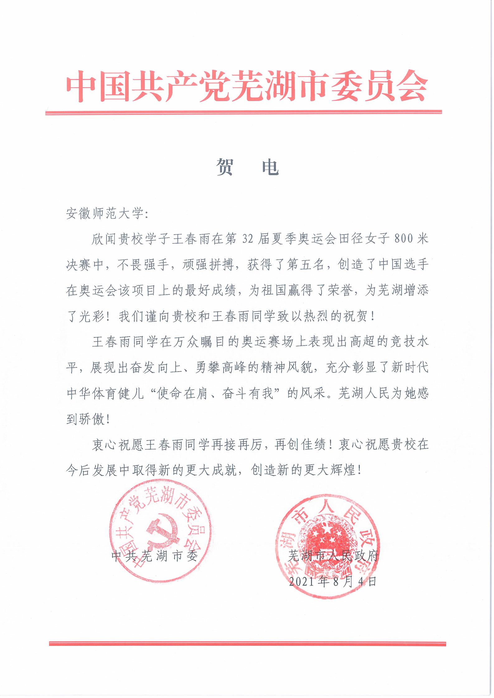 芜湖市委市政府在贺电中指出,欣闻安徽师范大学学子王春雨在第32届夏季奥运会田径女子800米决赛中,不畏强手,顽强拼搏,获得了第五名,创造了中国选手在奥运会该项目上的最好成绩,为祖国赢得了荣誉,为芜湖增添了光彩!我们谨向安徽师范大学和王春雨同学致以热烈的祝贺!王春雨同学在万众瞩目的奥运赛场上表现出高超的竞技水平,展现出奋发向上、勇攀高峰的精神风貌,充分彰显了新时代中华体育健儿“使命在肩、奋斗有我”的风采。芜湖人民为她感到骄傲!衷心祝愿王春雨同学再接再厉,再创佳绩!衷心祝愿安徽师范大学在今后发展中取得新的更大成就,创造新的更大辉煌!