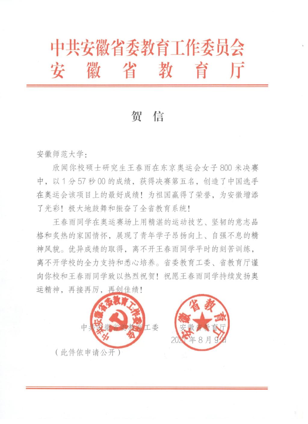安徽省委教育工委、省教育厅在贺信中指出,安徽师范大学研究生王春雨在东京奥运会女子800米决赛中,以1分57秒00的成绩,获得决赛第五名,创造了中国选手在奥运会该项目上的最好成绩!为祖国赢得了荣誉,为安徽增添了光彩!极大地鼓舞和振奋了全省教育系统!王春雨同学优异成绩的取得,离不开王春雨同学平时的刻苦训练,离不开安徽师范大学的全力支持和悉心培养。省委教育工委、省教育厅谨向安徽师范大学和王春雨同学致以热烈祝贺!祝愿王春雨同学持续发扬奥运精神,再接再厉,再创佳绩!