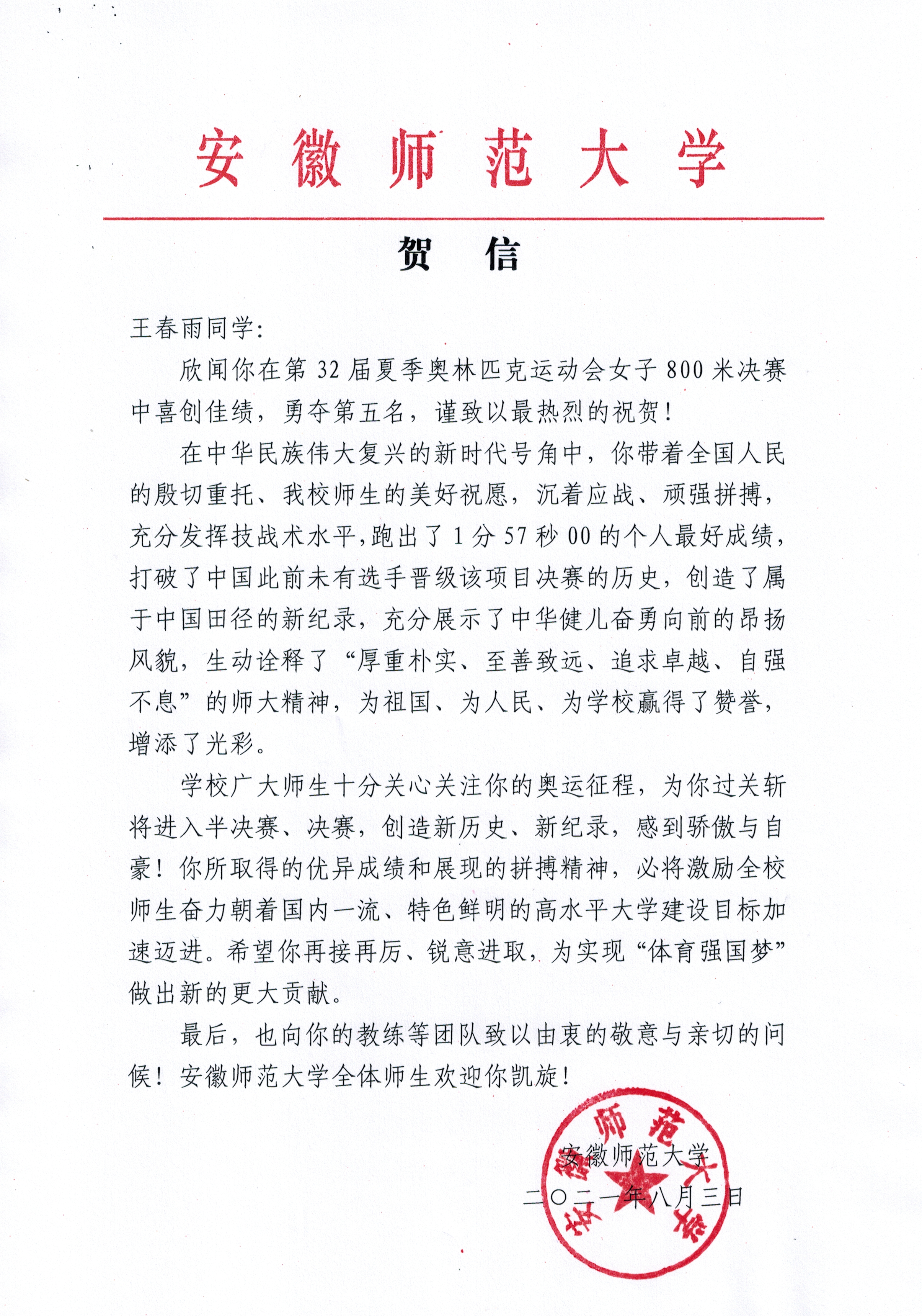 安徽师范大学在贺信中指出,在中华民族伟大复兴的新时代号角中,王春雨带着全国人民的殷切重托、我校师生的美好祝愿,沉着应战、顽强拼搏,充分发挥技战术水平,跑出了1分57秒00的个人最好成绩,打破了中国此前未有选手晋级该项目决赛的历史,创造了属于中国田径的新纪录,充分展示了中华健儿奋勇向前的昂扬风貌,生动诠释了“厚重朴实、至善致远、追求卓越、自强不息”的师大精神,为祖国、为人民、为学校赢得了赞誉,增添了光彩。学校广大师生十分关心关注你的奥运征程,为你过关斩将进入半决赛、决赛,创造新历史、新纪录,感到骄傲与自豪!你所取得的优异成绩和展现的拼搏精神,必将激励全校师生奋力朝着国内一流、特色鲜明的高水平大学建设目标加速迈进。希望你再接再厉、锐意进取,为实现“体育强国梦”做出新的更大贡献。安徽师范大学全体师生欢迎你凯旋!