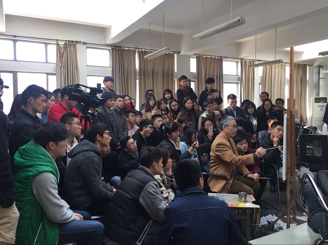 整个教学过程分为理论讲授、课堂示范两个部分。理论讲授时,李老师用春风化雨般的讲授将晦涩难懂的美学理论和难以言传的技法理论一一点拨开来,让聆听的学生获益匪浅。课程的后半部分为现场示范,课堂示范教学是专业教师教学中的要项,形同工作的伦理。现场写生是对教师技法能力和教学能力的双重考验,李老师采用这种教学方式,是“希望经由写生,寻获绘画的谦逊”。观摩课持续近两个半小时,围观学习的学生屏气凝神,大家都很珍惜这次现场观摩教学的机会,近距离感受着艺术家的创作过程,受益良多。