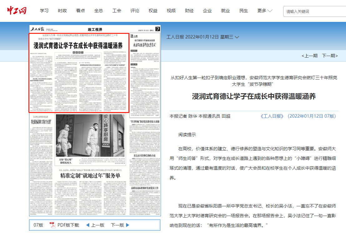 1月12日,《工人日报》第7版“政工视界”栏目头条以“从扣好人生第一粒扣子到确定职业理想,安徽师范大学学生德育研究会燃灯三十年照亮大学生‘拔节孕穗期’浸润式育德让学子在成长中获得温暖涵养”为题报道了我校学生德育研究会成立三十年来育人成效。文章指出,在高校,价值体系的建立、德行修养的塑造与文化知识的学习同等重要。安徽师范大学用“师生问答”形式,对学生在成长道路上遇到的各种思想上的“小障碍”进行精雕细琢式的清理,通过最有温度的对话,使广大会员和在校学生在个人成长中获得温暖的涵养。