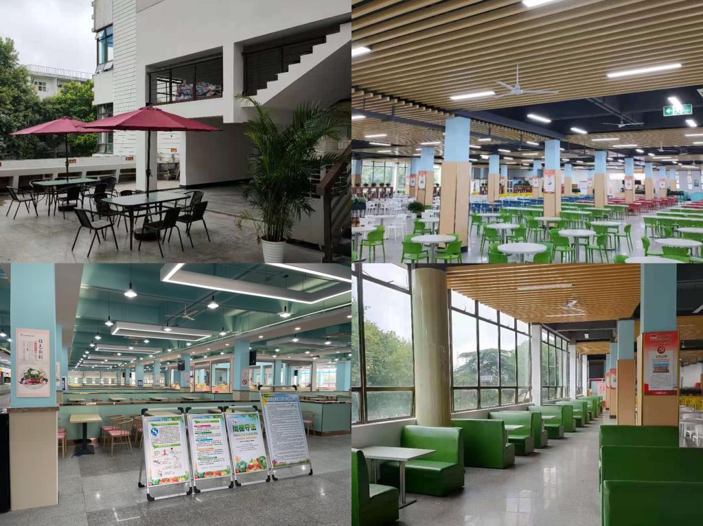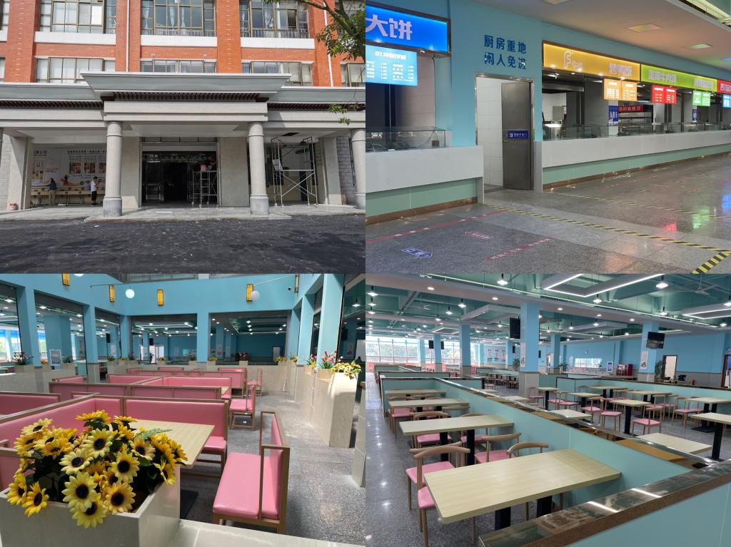 自上学期“网红食堂”之后,学校再次对学生食堂基础条件进行升级。花津校区新建一食堂门厅,并按照食品加工要求调整后厨布局,实现功能分明、流程清晰、人货分区、专间操作,为食品安全提供空间保障。更换二食堂扶手电梯,消除安全隐患。赭山校区二、三楼学生食堂进行整体改造,重新部署水、电、燃气管道线路,餐厅内安装了“明厨亮灶”监视器,对售饭台进行了包装,各售卖窗口上方对应安装屏幕价格牌,墙壁粉刷防水涂料,顶部吊顶重新美化,用餐区分区及餐桌椅更换,增设扶手电梯和货运电梯……改造后的学生食堂环境焕然一新,将给广大师生带来更加舒适、温馨的就餐体验。