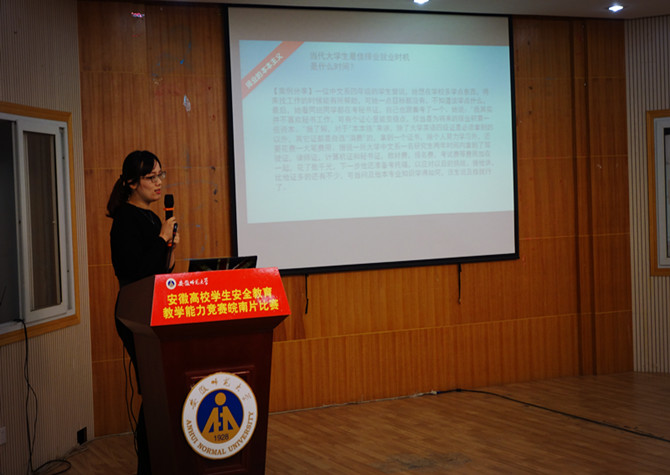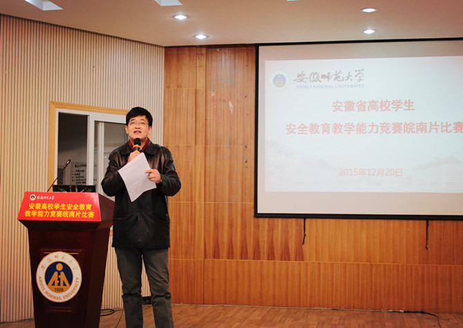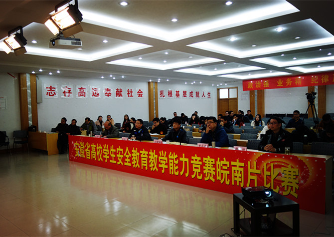 本网讯(保卫处 冯涛)为促进高校学生安全教育教学研究,提高安全教育教学质量,切实增强学生安全意识。2015年12月20日,第一届安徽省高校学生安全教育教学能力竞赛皖南片比赛在我校花津校区毕业生就业指导中心报告厅顺利举行。校保卫处处长孙成岗及相关专家出席比赛并担任比赛评委,皖南片18所高校37名从事学生安全教育的老师参加了比赛。