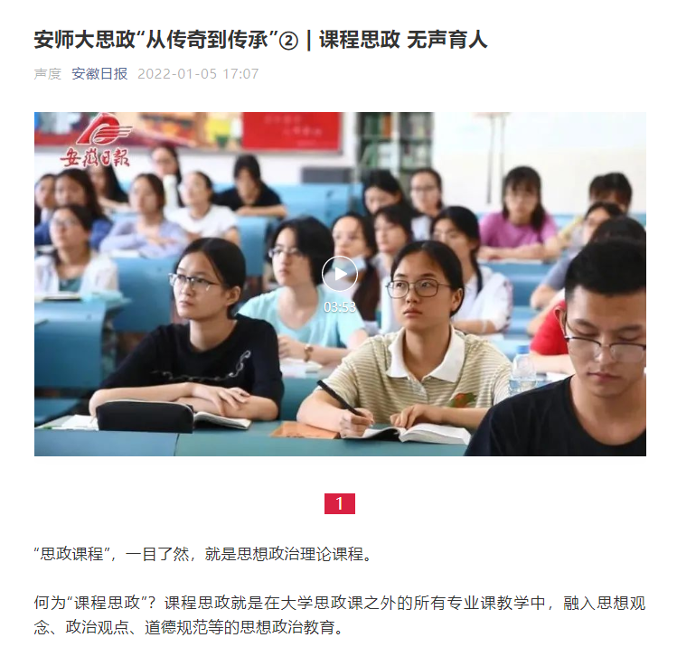 1月5日,《安徽日报》微信公众号推出我校思政育人工作系列融媒体作品第二期:安师大思政“从传奇到传承”② | 课程思政 无声育人。文章指出,课程思政将高校思想政治教育融入课程教学和改革的各环节、各方面,实现“春风化雨、润物无声”地立德树人、教书育人。“在显性教育中浸润隐性教育、在知识传授中渗透价值引领、线上学习和线下研讨相结合”,正是安师大文学院俞晓红教授开设的《大学语文》《红楼梦研究》成为每期超过1000多人选修的“网红”慕课的原因所在。