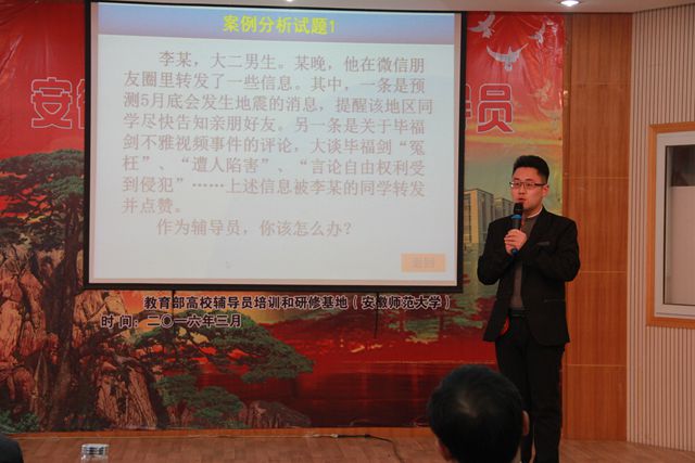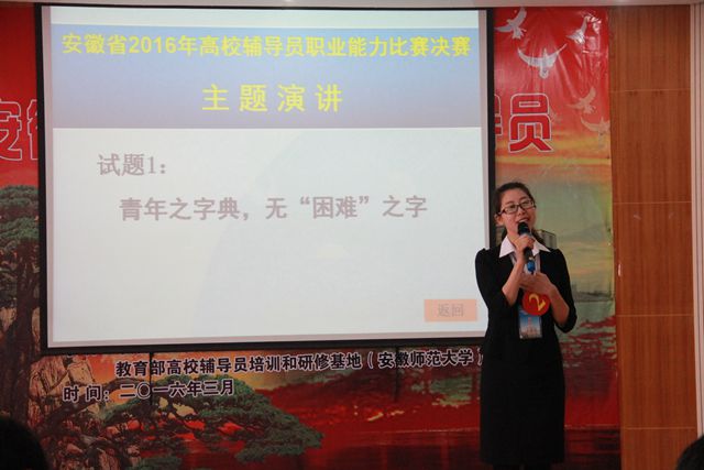 本网讯(辅导员基地 汤小宾)3月24日-26日,由中共安徽省委教育工委主办,安徽省高校思想政治教育研究会辅导员工作研究分会、教育部高校辅导员培训和研修基地(安徽师范大学)承办的安徽省2016年高校辅导员职业能力比赛决赛在我校成功举办。