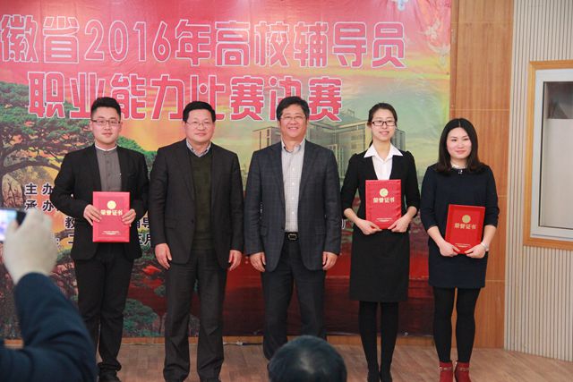 据悉,获得安徽省2016年高校辅导员职业能力比赛决赛特等奖和一等奖的10名选手将由教育部高校辅导员培训和研修基地(安徽师范大学)组织进行集中培训,代表安徽省参加四月下旬在南京师范大学举办的第五届全国高校辅导员职业能力大赛第六赛区复赛。