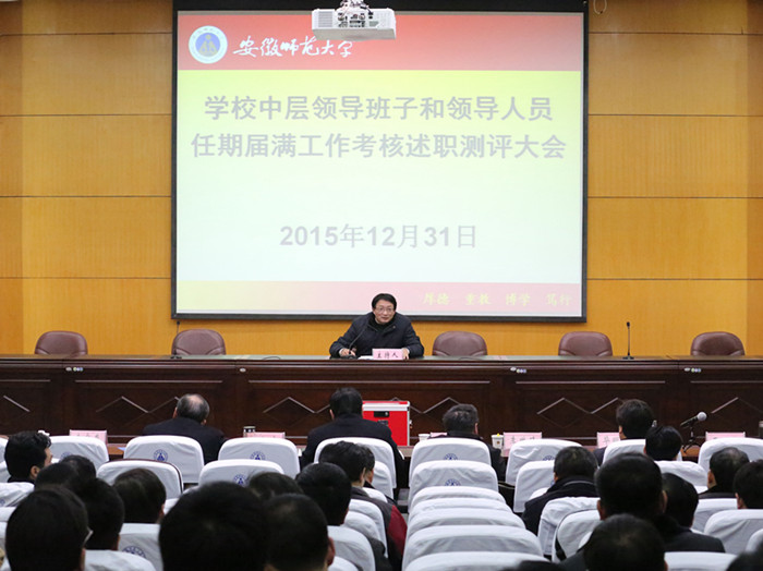 本网讯(党委宣传部 袁黎平/文 邾强/图)12月31日,学校召开中层领导班子和领导人员任期届满考核集中述职测评大会。校领导顾家山、王伦、程度、王绍武、李琳琦、朱家存、毕明福出席会议。学校中层领导人员、教代会执委、民主党派主要负责人、省级以上人大代表、政协委员、教职工代表、考核考察工作组成员参加会议。校党委书记顾家山、校长王伦分别主持述职大会。