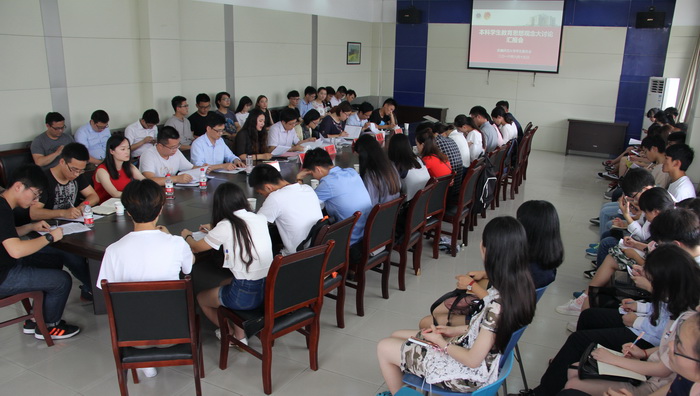 青通社讯(杨晨娅 魏鑫鑫 张光磊)6月15日下午,校学生会牵头召开的本科学生教育思想观念大讨论汇报会在花津校区大学生活动中心三楼会议室开展。校党委学工部部长、学生处处长台启权,校团委书记、学工部副部长梁燕,校学生会秘书长、团委副书记刘长生,校学生会副秘书长张薇薇、张海兵,各学院团委负责人、校院学生会负责人以及班级班长、社团会长代表参与会议。汇报会由校学生会主席盖晨飞主持。