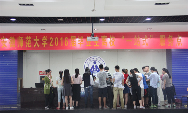 本网讯(学工处 李震)6月28日和29日,学校分别在花津校区大学生活动中心二楼就业招聘大厅和赭山校区图书馆一楼报告厅设立2016届毕业生离校“一站式”服务点,为毕业生提供离校手续办理、政策咨询和问题解答等周到便捷的离校服务。
