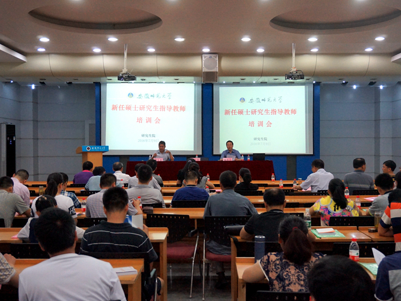 本网讯 7月9日,学校在赭山校区就业大厅举办了2016年研究生导师培训会,会议由研究生院副院长商永嘉主持。2015年新聘校内外硕士研究生导师、往期未参加培训导师、各培养单位分管研究生工作领导、研究生院工作人员100余人参加了培训会。