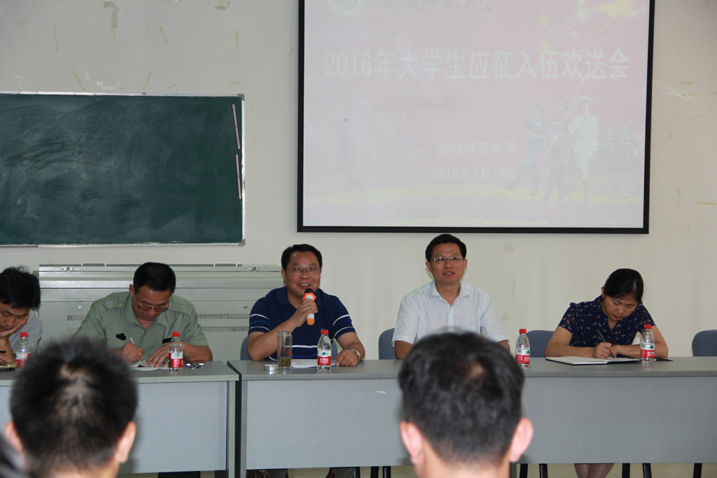 本网讯(文/齐怀峰 图/崔玉凤)9月13日上午,学校在花津校区创业模拟教室举行了2016年入伍大学生欢送会。校党委副书记李琳琦、人武部负责人、相关学院副书记、全体入伍大学生参加了会议。会议由人武部部长台启权主持。