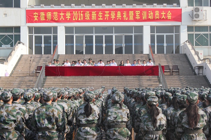 大会在雄壮的国歌声中拉开帷幕。王伦向2016级同学介绍了安徽师范大学校史校情并对其提出殷切希望。王伦指出,安徽师范大学是一所历史悠久、底蕴深厚的大学,在88年的办学历程中,一代代师大人潜心耕耘、薪火相继、言传身教,为民族振兴、国家发展和教育进步,做出了卓越贡献,凝练形成“厚德、重教、博学、笃行”的校训和“厚重朴实、至善致远、追求卓越、自强不息”的师大精神;安徽师范大学是一所成就辉煌、声誉良好的大学,建校以来,累计培养全日制高等专门人才20余万人,为全省高校之最,涌现出了一大批遍布海内外、在社会各界有着重要影响的知名校友,先后入选安徽省人民政府与教育部共建高校、国家“中西部高校基础能力建设工程”项目建设高校和“地方高水平大学”项目建设高校;安徽师范大学也是一所充满情怀、诗情画意的大学,她从建校伊始就秉承包容、友爱、质朴、谦逊的情怀,用师大特有的文化来影响人、感染人、教育人,学校为每一位学子施展才华、实现抱负创造了足够好的条件、足够大的舞台。