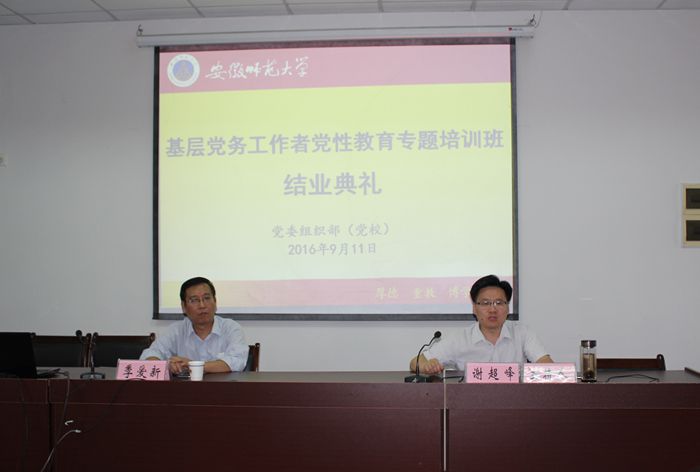 本网讯(党委组织部 李古州)9月11日,学校“两学一做”学习教育基层党务工作者党性教育专题培训班举行校内培训暨结业典礼。校党委组织部部长季爱新出席培训班结业典礼并作总结讲话,组织部副部长谢超峰主持了结业典礼。培训班全体学员,院级党组织、党委部门秘书共70余人参加了校内培训和结业典礼。