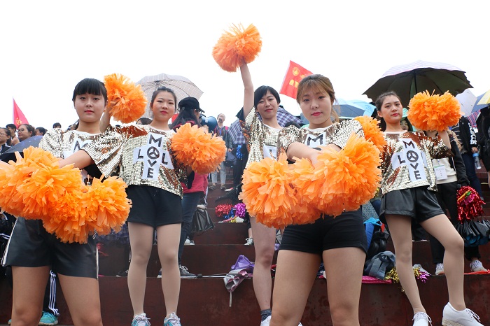 20日下午,雨势逐渐增强,豆大的雨点纷纷滴落,阴冷寒凉。而在观众席边,身着短裙的啦啦队姑娘们依然坚持为各自的方阵起舞,来不及披件衣服,不一会儿,每个队员的头发都已经被雨水打湿,但她们面对镜头,依然绽放出最美的笑容。青春的激情,灵动的舞步,融汇成赛场上一道靓丽的风景线。