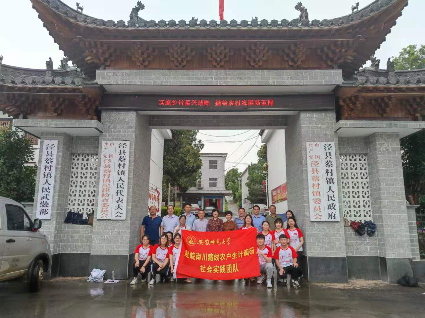 本网讯(地旅学院 韦银艳、陈祥云)7月17日下午,副校长彭凤莲,校团委副书记廖仲明、地旅学院党委书记贾冠忠、院长苏勤、党委副书记乔静一行来到泾县蔡村镇,亲切慰问地旅学院赴皖南川藏线农户生计调研实践团队的全体队员,泾县人民政府副县长张素兰、费罗成,蔡村镇党委书记蒋光庭、党委组织委员汪奇,泾县团县委副书记杨勤等同志热情接待了彭凤莲一行,并举行安徽师范大学赴泾县蔡村镇暑期“三下乡”大学生社会实践团队座谈会暨大学生社会实践基地合作共建挂牌仪式。活动由泾县副县长、我校地旅学院挂职干部费罗成主持。