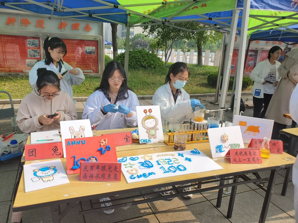 “水晶原来有这么多类型,而且还可以作画,我真的是第一次见到。”在“‘晶’制传承·红心向党”晶体制作活动成果展前,化学与材料科学学院同学正带领来往学子开展“晶体”制作体验。蓝色的硫酸铜、金黄色的碘化铅、绿色的氯化铜、白色的硝酸钾、红色的铁氰化钾以及草绿色的三草酸合铁化钾......在化材学院学生手中,深奥难懂的化学材料成为了绘画的“颜料”。“这些颜色是同学们通过不断实验,将不同物质的化学反应来析出晶体或利用溶解度随温度改变而变化较大的物质重结晶合成而来的。晶体生长的过程缓慢而又美丽,厚积薄发,最终获得璀璨闪耀的成果,一如我们党和团的百年光辉历程。一幅幅晶体创作图也是化材学子对党和国家最真挚的祝福”化材学院2018级材料化学专业黄宁宁介绍到。