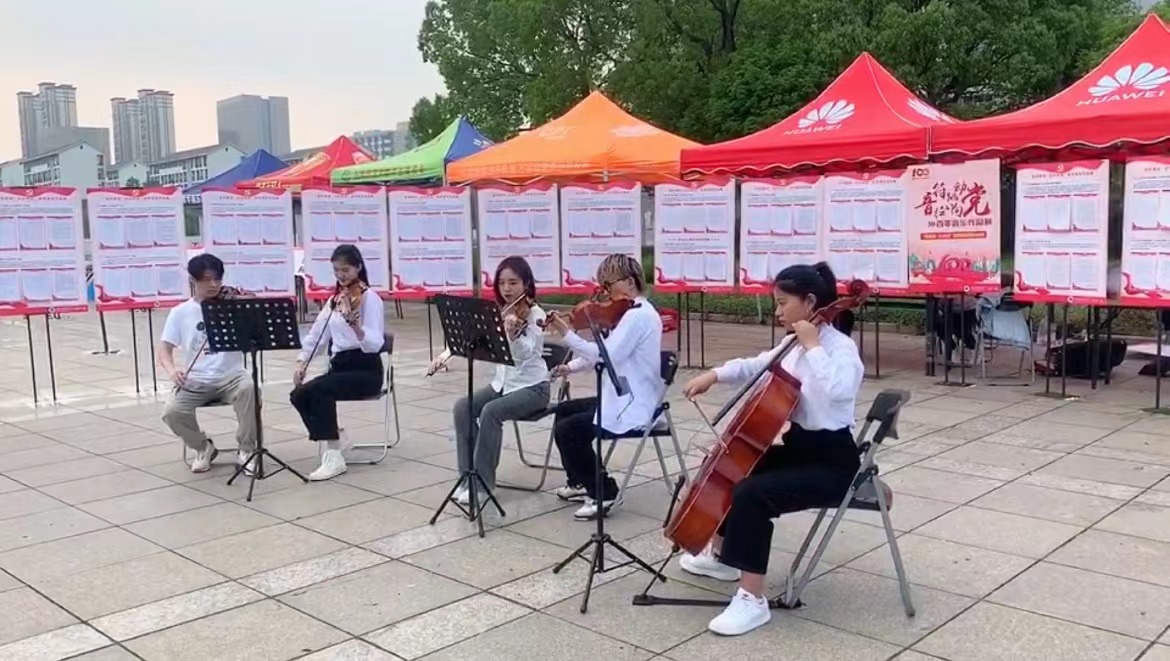 音乐学院结合专业特点,面向全体学生开展“音符跳动·红心向党”红歌乐谱设计以及时空对话信件活动,在展出现场更是用优雅的小提琴演奏,让红色歌曲飘扬在校园之中。“红色音乐记录了一个民族觉醒的奋进史,记录着中国共产党领导中国革命、建设、改革、奋进新时代的恢弘历程,是党和人民宝贵的精神财富,蕴含着丰富的时代记忆和红色精神。为了讲好思政课,我与同学一起选取能够体现共产党、共青团百年历程的代表性曲目,为同学们讲解红歌的时代背景以及所表达的含义引导同学开展乐谱设计。与我而言也是一场深刻的思想学习”《中国音乐史》课程专业课教师李城说。