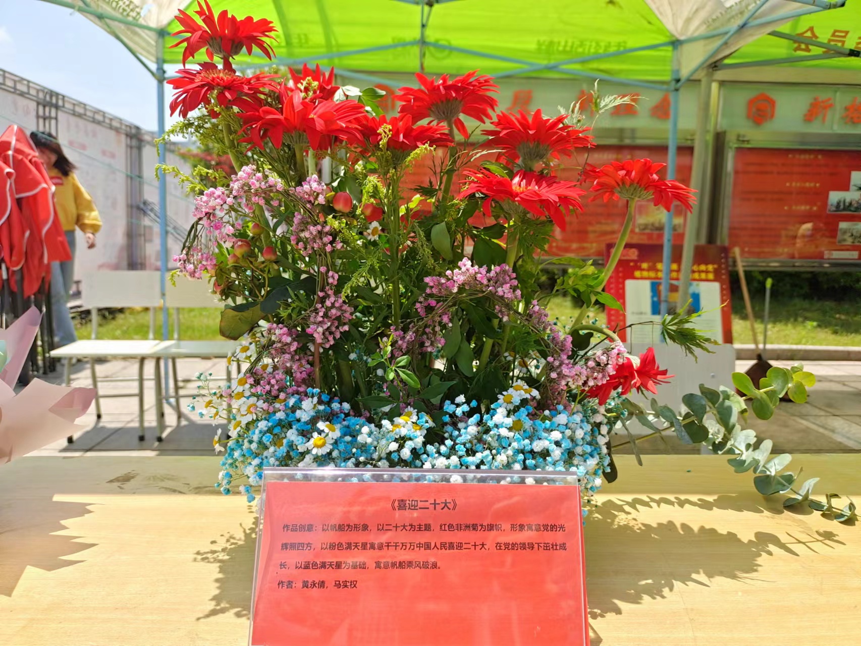 “百合花象征着纯净、清澈的爱。习近平总书记在庆祝中国共产主义青年团成立100周年大会上深情寄语青年‘清澈的爱,只为中国’。今天我们这节课就以百合花为基础元素,以‘永远跟党走’为主题进行设计创作”在生命科学学院《花卉学》课堂上,园艺专业副教授涂传林带领学生进行花艺制作。学生们积极响应,设计出了一件件精美的插花作品。“这件插花作品名叫《喜迎二十大》,同学们以帆船形象为花托,以红色雏菊汇成旗帜,以粉色满天星做出‘20’造型寓意千千万万中国人民喜迎二十大、永远跟党走的坚定信念。”看到同学们用心制作的作品涂传林老师动情说到“在花艺设计过程中,我与学生一起学习知识、收获成长。同学们也很感兴趣、主动研究,用年轻人的话语来说,这就是一场‘双向奔赴’的教育吧。”
