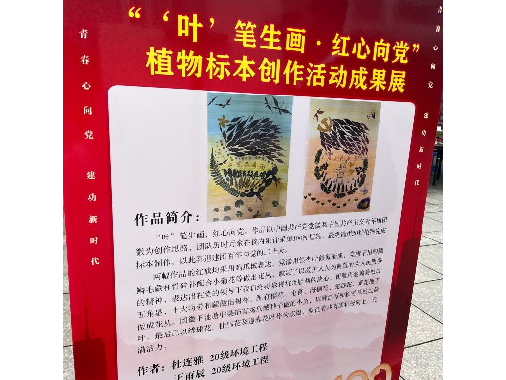 “一草一木都可以是爱国主义、爱校荣校教育的课堂”生态与环境学院师生团队开展了“植物调查及植物标本的采集与制作”专题讲座,百余名学生参加培训,团队梳理了安徽师大百种植物名录、植物标本、植物叶片标本画.......一幅幅标本画满含巧思,引得师生驻足观看。在“‘叶’笔生画·红心向党”植物标本展区。2020级环境工程杨楠、王雪茹正在介绍他们的标本画作品。“我们在校园中采集了百余种植物。最终使用了100片树叶、20种植物拼绘出党徽与团徽的图案,寓意着党的二十大与建团100周年。在选取何种树叶上,我们对 植物习性做了很多研究,最后选定在高大树木庇荫下而生、向阳而长的鸡爪槭为旗帜的拼接元素,也象征着我们青年人在党的光辉照耀下,茁壮成长。”