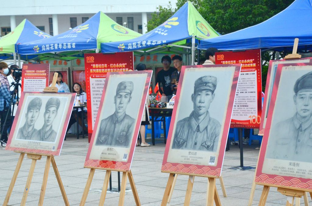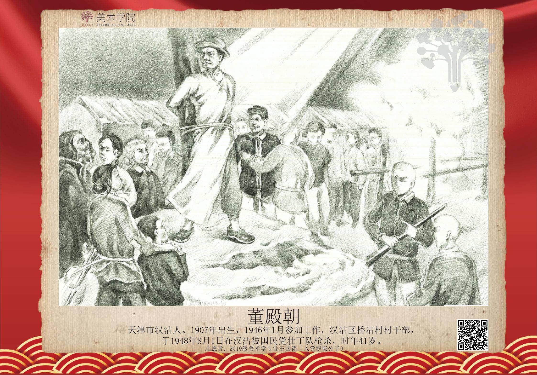 “这是一张特别的画像,遵从家属意愿,我画的是董殿朝烈士牺牲时的场景。他牺牲时年仅41岁。”在“追忆容颜·红心向党”肖像画创作活动展前,2019级美术学本科生王国铭说到“绘制的过程也是一次党史学习教育的过程。在绘制前,为了更好的展现董殿朝烈士在被敌人用刑之后,仍然坚守秘密、宁死不屈的感人场景与伟大精神。我查询了大量史料知识,内心深受震撼。我用自己的笔触和设计,让我与董殿朝烈士有了一次心灵的交流”。自2021年11月起,安徽师范大学美术学院青年学子通过“为烈士画像”的课程思政活动,实现了一次次催人泪下的“相聚”、一场场跨越时空的“团圆”。