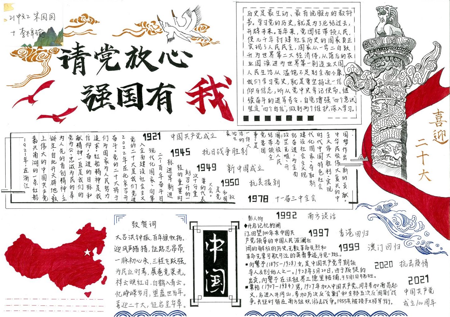 “手抄报、三字技能是我们师范类专业的必修课,与传统的讲台式课堂相比,在这样的实践活动中开展思政教育更加有趣,对我们非常有吸引力,也极大地激发了我们的学习热情。”21级思想与政治专业的汪乐怡是文学院、教育科学学院主办的“翰墨丹青·红心向党”手抄报创作活动获奖作品《红心向党》的作者,当谈到自己的创作思路时,她说道:“中国共青团的百年历程,是一部党领导青年运动的百年奋斗史。我精心绘画了南湖红船,中国的山川河流,查阅大量资料,配以党史文字,体悟中国文学里的‘家国情怀’,希望用这种方式表达心中对祖国的深深祝福。”