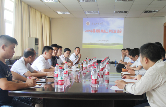 为切实推进暑期维修工作,学校于7月28日召开了在建工程施工单位负责人座谈会。后管处介绍了施工进程中存在的问题,施工单位负责人谈了需要学校解决的困难。毕明福副校长出席会议并讲话,对施工人员冒着酷暑为学校建设服务表示感谢,就工程质量进度安全等进一步明确要求。他希望施工单位要严把质量,建良心工程,做到施工材料合格、流程严谨、工艺规范;要严格自律,做守法企业,做到合法用工、依法施工,关心一线工人,遵守廉洁协定;要严守合同,当重信誉单位,依据工程量清单、技术说明等施工,不拖工期,不超造价;要严格管理,创安全文明工地,维护好施工环境设施,确保工人和师生安全。