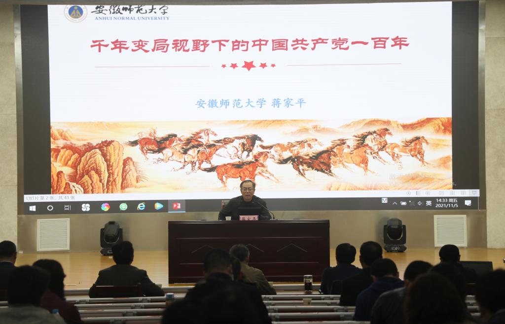 蒋家平结合学习贯彻习近平总书记“七一”重要讲话精神,以“千年变局视野下的中国共产党一百年”为主题,深刻阐述了近代以来中华民族救亡图存的艰难历程,以及中国共产党准确识变、科学应变、主动求变,团结带领全国各族人民不懈奋斗,在“四个历史时期”所创造出的“四个伟大成就”。他指出,中国共产党经过一百年的艰辛探索,成功破解了近代以来中华民族所面临的国家、社会、文明“三重困境”,创造出中国式现代化新道路和人类文明新形态。特别是在中国特色社会主义新时代,推动党和国家事业取得历史性成就、发生历史性变革,中华民族的面貌发生了前所未有的变化,深刻影响了中国,也深刻影响了世界,中华民族伟大复兴进入了不可逆转的历史进程。