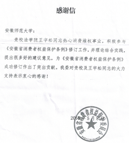 2015年5月,“安徽省消费者权益保护条例修订”立法协商会在合肥召开,我校法学院教师王宇松博士所撰写的《国外保护消费者权益的主要做法及其对我省消保条例修订的启示》一文被会议采纳,省消费者权益保护委员会专门来函向王宇松老师表示感谢。“学问应苦心踏实钻研,学问须益于国事民生,在很多人印象里法学是一件很枯燥的学科,而我们更倡导将先进的学术研究成果更迅速、更充分地投入民众的日常生活中。”面对记者的采访,王老师如是说。