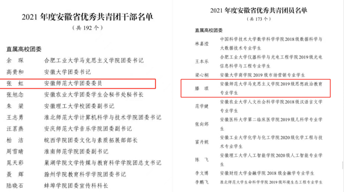 为表彰先进、树立典型,激励广大团组织和团员、团干部向先进学习、向优秀看齐,共青团安徽省委决定,集中表彰一批团学组织先进集体、优秀个人。其中,我校青年教师、团委委员张虹荣获“安徽省优秀共青团干部”称号,马克思主义学院2019级思想政治教育专业本科生滕琪荣获“安徽省优秀共青团员”称号。