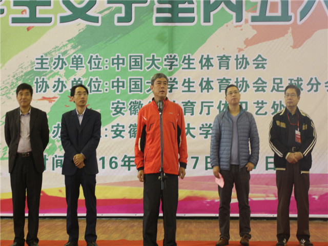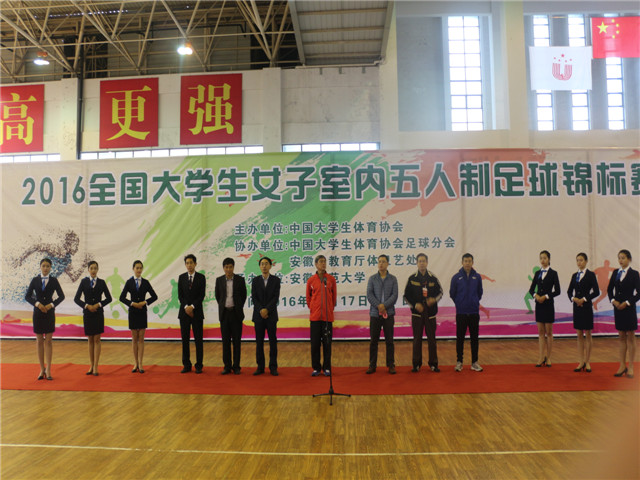 本网讯(体育学院 朱凯迪 孙昊) 为深入推进校园足球工作,逐步形成校园足球氛围,11月19日上午,由中国大学生体育协会主办,我校体育学院承办的全国大学生女子室内五人制足球锦标赛在学校北体育馆隆重开幕。安徽师范大学副校长朱家存致欢迎辞,教育部体卫艺司体育处副处长陈红新宣布比赛开幕。大体协、省教育厅相关领导出席开幕式,安徽师范大学体育学院院长席玉宝主持开幕式。
