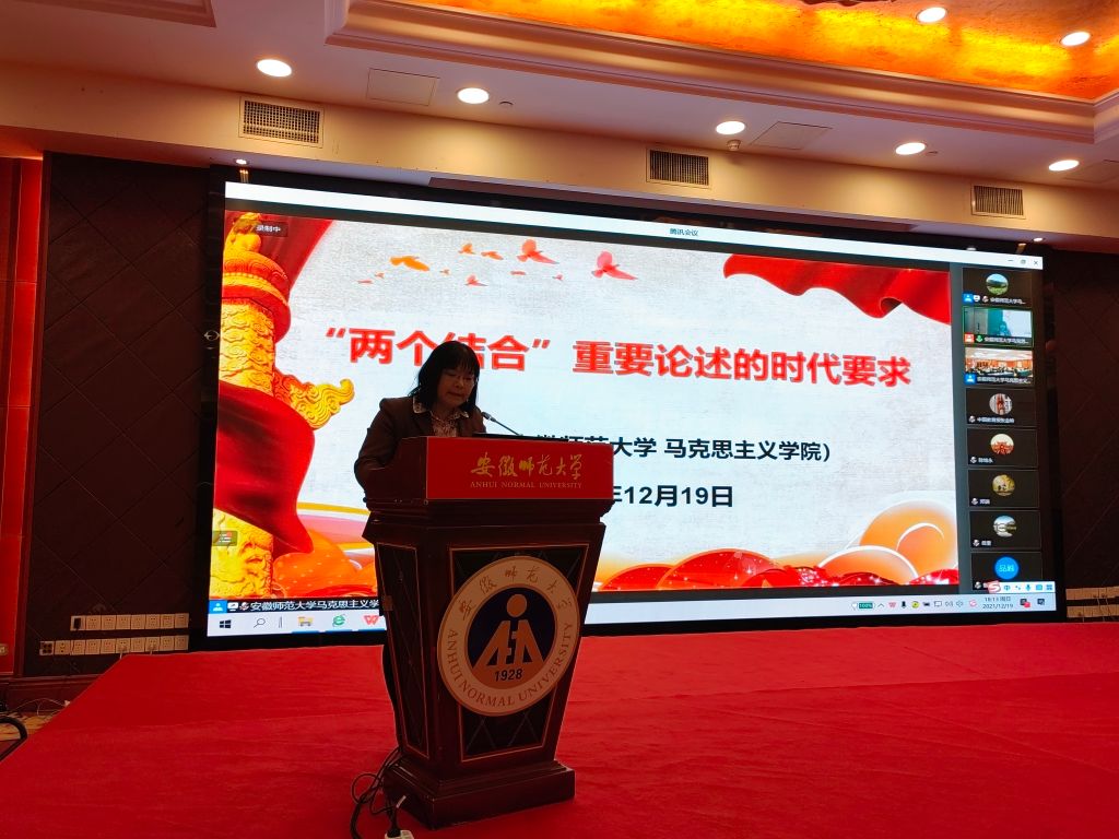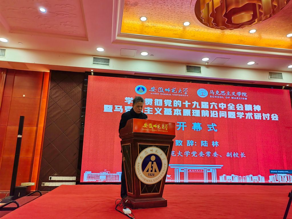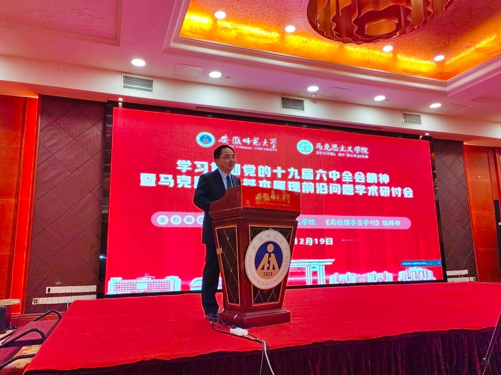 12月19日,由安徽师范大学马克思主义学院、《高校辅导员学刊》编辑部主办的“学习贯彻党的十九届六中全会精神暨马克思主义基本原理前沿问题学术研讨会”以线上线下相结合的方式召开。中共中央党校(国家行政学院)韩庆祥教授、清华大学艾四林教授、吉林大学韩喜平教授、华中科技大学欧阳康教授、天津大学颜晓峰教授、南京大学胡大平教授、上海财经大学鲁品越教授、北京大学陈培永研究员、中山大学林进平教授、华中科技大学岳奎教授、兰州大学杨宏伟教授、安徽师范大学汪盛玉教授应邀参加研讨会大会发言,安徽师范大学马克思主义学院以及芜湖市其他高校马克思主义学院近50名专家代表现场观摩,来自全国高校1000余名学者线上参加了会议。学术研讨会开幕式由安徽师范大学马克思主义学院院长姚宏志教授主持,校党委常委、副校长陆林致开幕辞。
