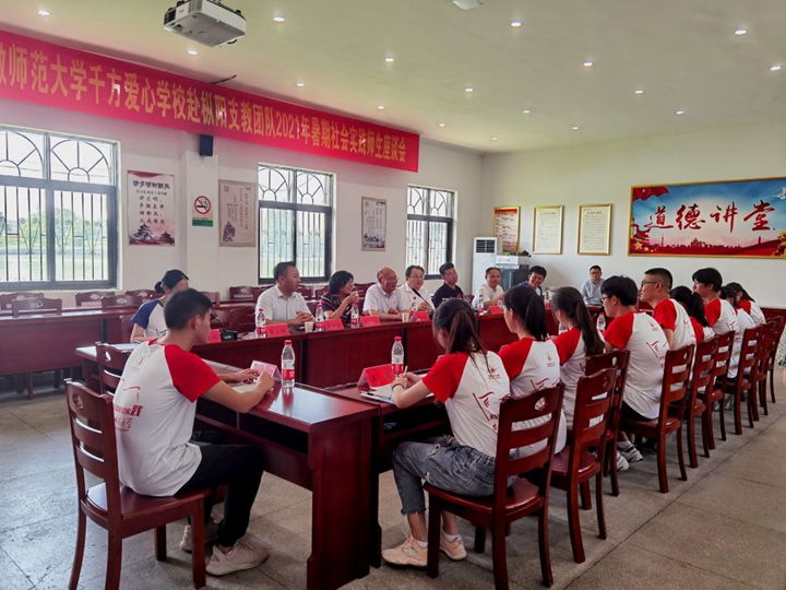 师生座谈交流走心走实,谈体会话成长。现场观摩宣讲和授课后,调研组一行在县总工会会议室召开了师生座谈会。杨贤招致欢迎辞,对安徽师范大学领导老师一行表示欢迎,并对支教队员们的辛勤付出予以高度评价,并介绍了枞阳县的悠久历史和发展情况。实践队员结合自身专业特色和前期支教经历,分享实践体会收获。团队队长俞陈超从团队建立、成员概况、课程安排等介绍了千方爱心学校赴枞阳爱心支教团队的基本情况。小老师们纷纷感慨到“原来想当好一名老师是这般的不易”“支教时间虽然只有两周,但我们要尽力在学生心理埋下美好的种子”“我们在实践中收获了教育学生带来的使命感、收获了自己动手带来的成就感,收获了感动家长带来的责任感”……。周新发代表学校感谢枞阳县党委县政府和团枞阳县委对学校暑期社会实践的大力支持,鼓励实践学子们要学深悟透习近平总书记“七一”重要讲话精神,不断增强做中国人的志气、骨气、底气;要以实现中华民族伟大复兴为己任,做到立大志、明大德、成大才、担大任;要珍惜青春韶华,在实践中受教育、长才干、作贡献、树形象。