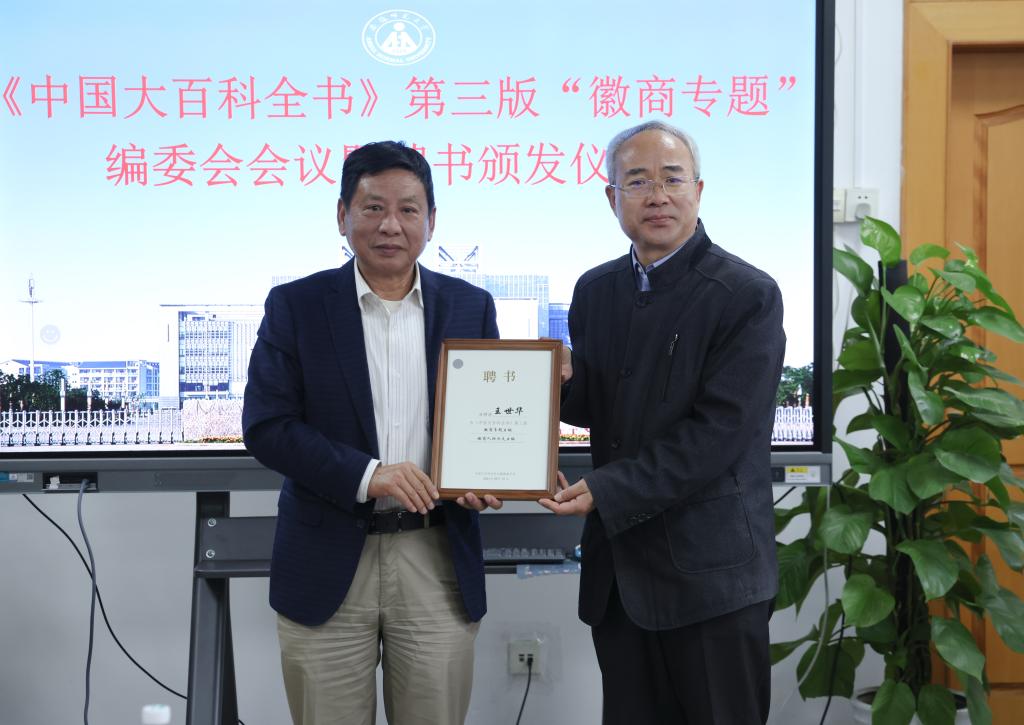 随后,刘祚臣分别向《中国大百科全书》第三版“徽商专题”编委会主编、副主编、分支主编等颁发了聘书。