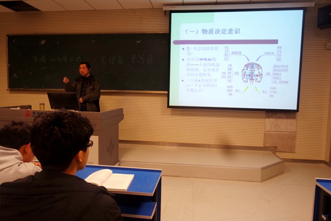 本次授课的主题是“物质与意识的辩证关系”。彭老师首先带领同学们回顾了上节课有关物质、运动、时空等相关知识,为同学们进入物质和意识辩证关系的主题做了必要的衔接。在对意识含义予以阐述之后,彭老师条分缕析地就“物质对意识的决定作用”和“意识对物质的能动发作用”展开了细致的澄明。结合精心挑选的图片,分析了意识产生过程中“自然进化”及“社会劳动”的双层作用,阐明意识的产生不仅是自然界长期发展的产物,也是社会的产物;就人类和其他高等动物对“工具”的使用问题,彭老师认为黑猩猩等高等动物对工具的使用最多只能做到肢体的延伸,而人对工具的使用则能够做到脑力的延伸。针对教材中“意识是人脑特有的机能”的断言,彭老师提出“动物有意识吗”的疑问,为后面对意识能动性问题的分析埋下了伏笔。接着,彭老师通过引用莎士比亚、鲁迅及马克思的名言,剖析了“意识是客观世界的主观映象”的命题,指明意识与物质既有联系又有区别;意识是客观内容和主观形式的内在统一;意识主体自身的差别性也会对意识的形成产生影响。最后,彭老师论述了意识对物质能动反作用的具体表现。在谈到人类意识具有目的性和计划性时,彭老师引导同学们去思考“人类和动物在目的性和计划性上的区别”问题,指明动物的所谓目的和计划,是受动物本能驱使的,而人类行为中的目的和计划则还有道德规范与法律规范等社会方面的考量,人的活动不是完全受本能驱使的动物行为,而是一种更高级的社会的活动,从而使同学们对意识是人脑特有的机能和属性以及人类意识能动性的表现等原理有了深刻的体会。