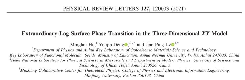 本网讯(物电学院 张曼)近日,物理学国际顶级期刊《物理评论快报》(Physical Review Letters)发表了我校物理与电子信息学院吕建平教授课题组与中国科学技术大学和福建闽江学院邓友金教授合作完成的研究工作。论文标题为:Extraordinary-Log Surface Phase Transition in the Three-Dimensional XY Model,我校2019级硕士研究生胡明辉是论文的第一作者,邓友金教授和吕建平教授为共同通讯作者,我校是论文的第一署名单位。