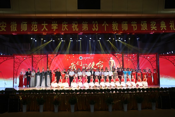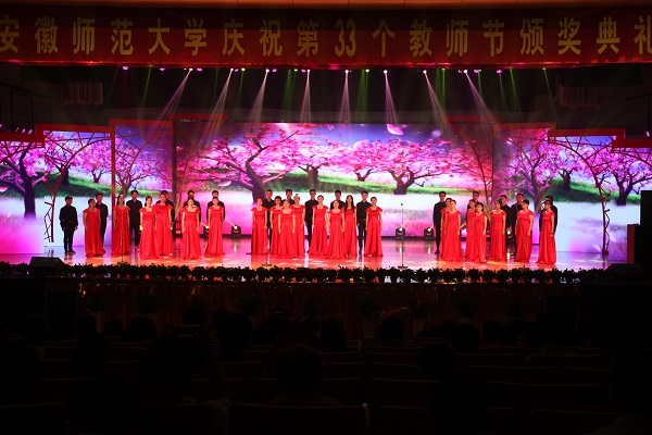 文艺节目以歌声、舞蹈、民乐的形式为广大教职工送上节日的祝福。开场舞蹈《师道传承》古风古韵,在汉服书简中闪耀着教师肩负传承文明的责任与担当。男声三重唱《把一切献给党》歌颂了党员教师的不忘初心,敬业奉献,反映了学校始终坚持社会主义办学方向,围绕中心抓党建、抓好党建促发展的办学思路。民乐合奏《京韵·夜深沉》表现了学校教师潜心育人、润物无声的无私品质。舞蹈《青春筑梦》展现了学校教师兢兢业业,为青春梦想铺设大道康庄的矢志不渝;歌曲《飞来的花瓣》展现了我校教师躬耕杏坛、春风化雨、灼灼其华的美好追求。《安徽师范大学校歌》的合唱,唱出了学校代代相传的育人情怀。