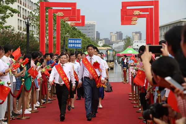 大礼堂前的红毯秀热闹非凡。伴随着昂扬欢快的音乐,受表彰老师和受表彰单位代表佩戴大红花,神采奕奕,精神抖擞的踏上红地毯,穿过典雅的祥云柱,在充满敬意的掌声和欢呼声中走过红毯,在签名墙前签名留念。