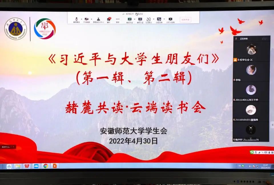 思想政治教育专业2021级本科生李凤勤在读后感中写道“习近平总书记身体力行,无论环境艰苦,仍然坚持读书学习。离家万里的行李箱装的全是厚厚的书籍,随声携带工具书、中华经典名著烂熟于心,坚持写读书笔记。习近平总书记每一个关于读书的好习惯都值得我们学习和借鉴。”动画专业2020级本科生尹瑞怡在读后感中写道“当我们只把目光聚集在个人兴趣、‘将来饭碗’这些小的地方、近的地方时,我们的视野就会狭窄,思维也会刻板起来……而当我们把个人同国家、民族,同社会、时代结合在一起,将个人的理想融入时代的大潮中,为实现中华民族伟大复兴的中国梦贡献自己的技术力量,我们的个人价值才会在历史洪流中得以体现。”在4月30日举办的云端读书会上,地理科学(师范)专业2021级本科生韦绮雯从青年意义、知恩图报、追逐梦想、提升自我四个方面分享了她的感受,并表示作为一名师范生,自己将会牢记习近平总书记的教诲,坚定理想信念,练就过硬本领,保持初生牛犊不怕虎的劲头敢做敢为。汉语言文学(师范)专业2021级本科生雷天琴从增强本领、知行合一、逐梦远方三个角度来讲述自己的观点。在她看来,青年应有壮士断腕的勇气,凤凰涅槃的决心和“功成不必在我、功成必定有我”的崇高追求和伟大理想,千锤百炼,潜心躬身,真正成为现代社会需要的复合型人才。汪凯也和大家分享了自己在阅读《习近平与大学生朋友们》第一辑、第二辑时的心路历程和深刻体会。他鼓励同学们利用大学四年多读书、读好书,通过阅读来提升自己在理论上的厚度、作风上的硬度、情感上的温度,同时要坚定文化自信、秉持人类关怀、将小我融入大我。